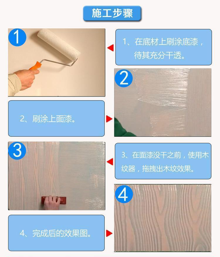4、可呈現各種木紋狀藝術圖案,圖案隨意、細膩、無接縫、不起皮、不開裂,底色和面色可以自由搭配,圖案可任意創作。古色古香,壽命長;