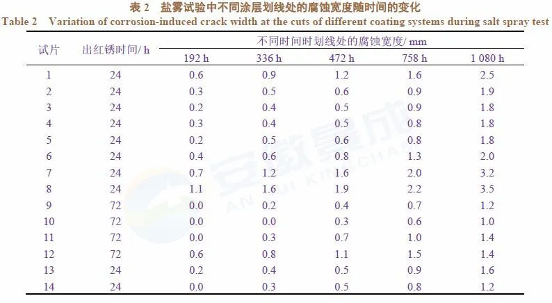 本文制備了如表1所列的14種膜厚的試片(部分按鹽霧試驗要求劃上交叉線)來考察涂層的性能,其中1−8為靜電噴涂粉末面漆,9−12為靜電噴涂粉末底漆+粉末面漆,13為一般溶劑型防腐涂裝,14為溶劑型重防腐涂裝。